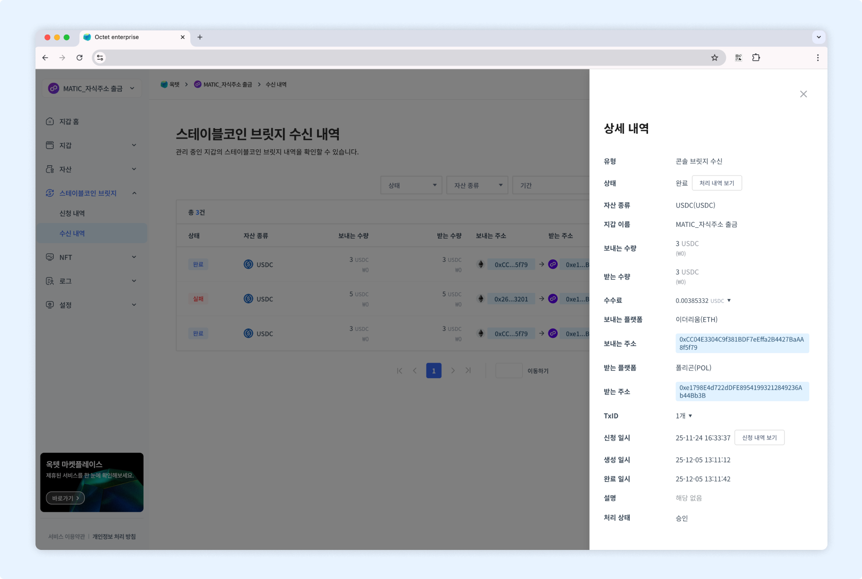 스테이블코인 브릿지는 서로 다른 블록체인 네트워크 간 스테이블코인을 이동시키는 기능입니다. 옥텟 지갑에 보유 중인 스테이블코인을 외부로 보내지 않고 브릿지를 진행할 수 있습니다.