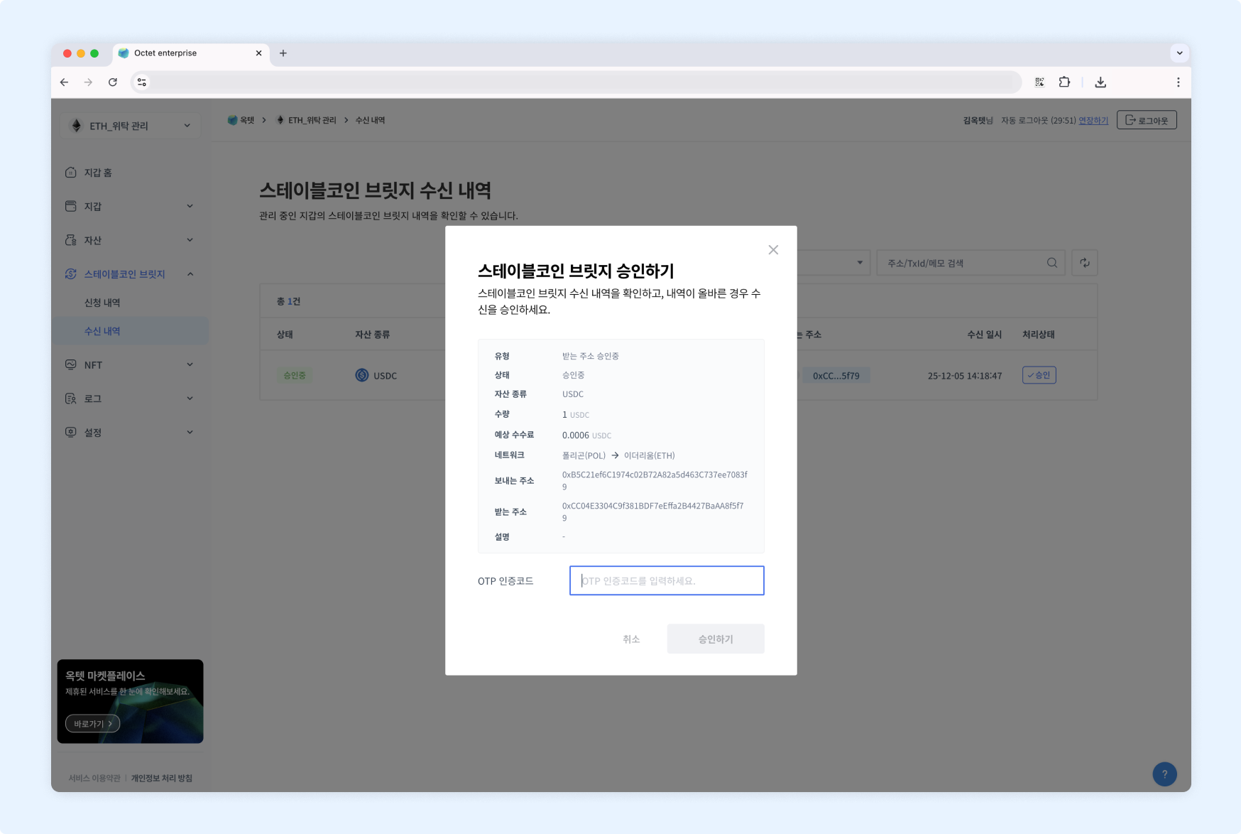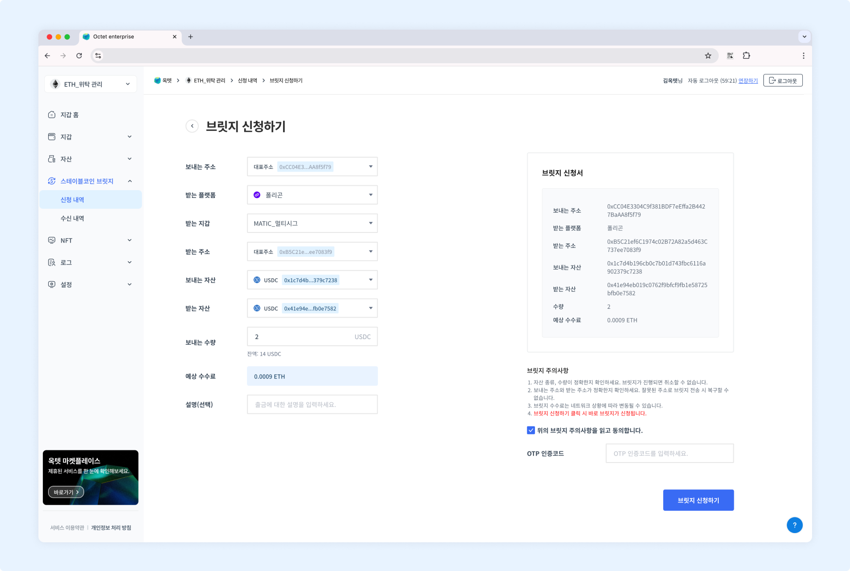 6. OTP 인증코드를 입력하고 브릿지 신청하기 버튼을 클릭하세요. 브릿지 신청이 완료됩니다.