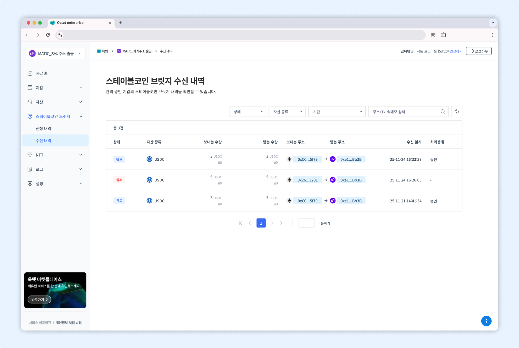 권한이 있는 모든 지갑에서 발생한 브릿지 신청 내역을 조회할 수 있습니다.
