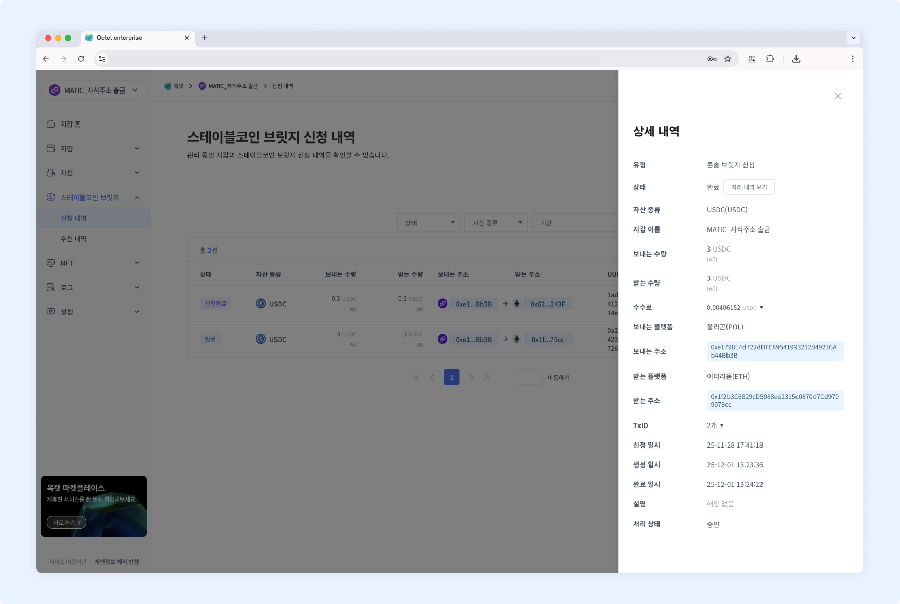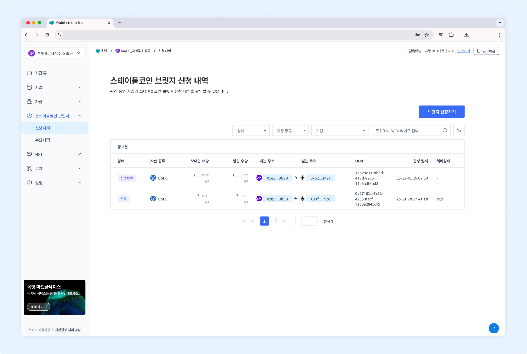 이를 클릭하면 브릿지 신청 처리 내역을 확인할 수 있습니다.