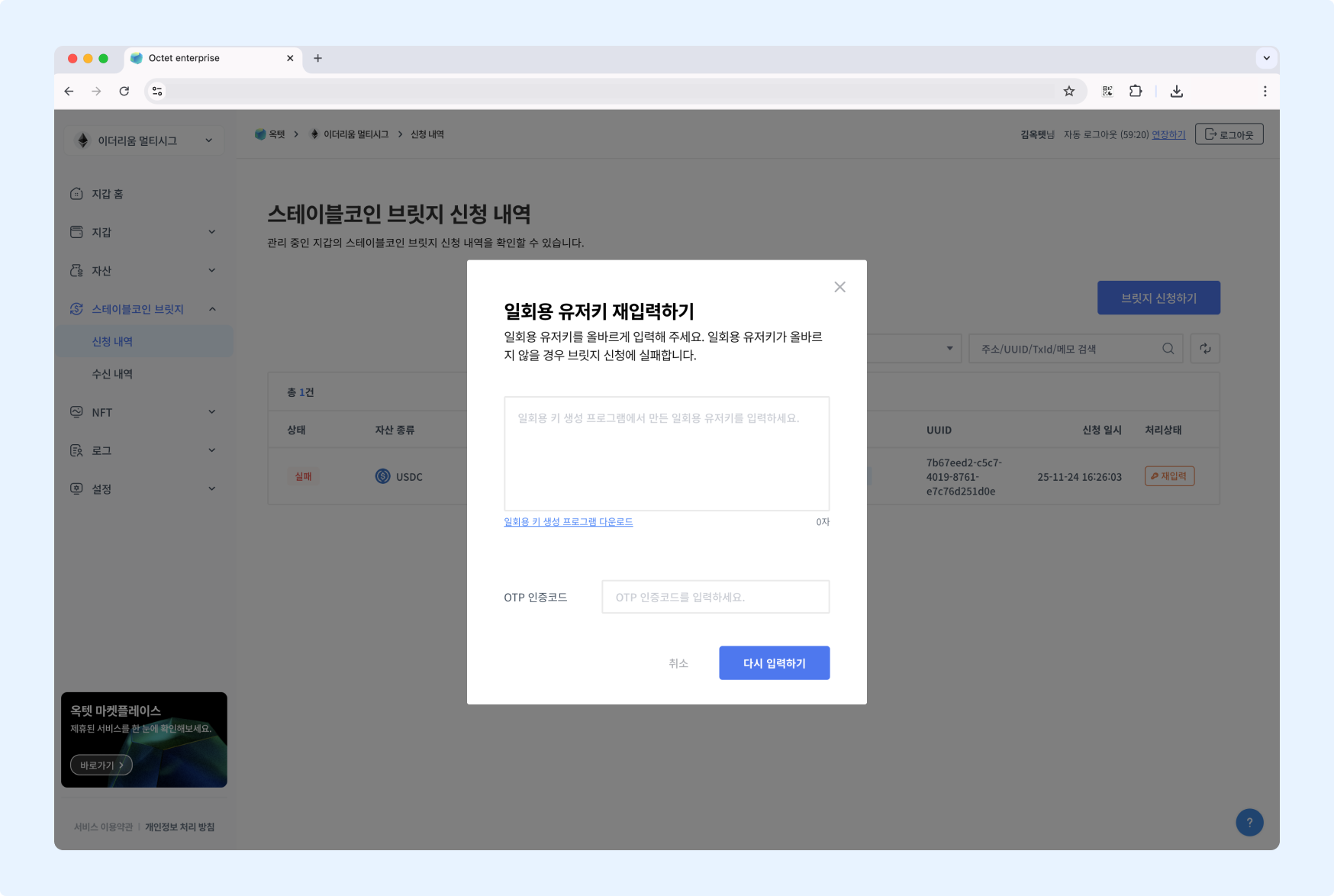 브릿지 신청 및 수신 지갑의 키 관리 유형이 공동 관리일 경우, 브릿지 신청 및 승인 시 일회용 유저키를 생성하여 사용해야 합니다. 일회용 유저키가 올바르지 않을 경우 브릿지 신청 및 수신에 실패합니다.