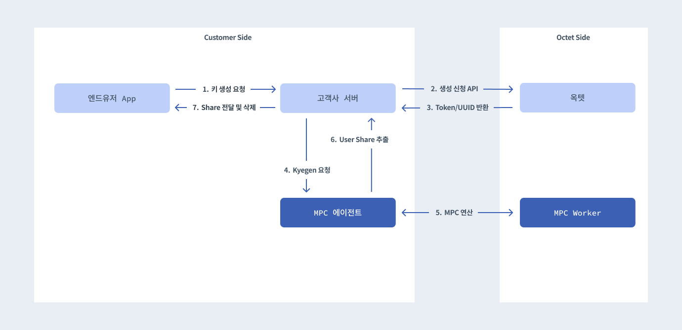 - MPC 키 생성 신청: 고객사는 옥텟 API를 호출하여 키 생성 작업을 요청하고 인증 토큰을 받습니다.