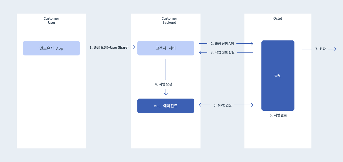 MPC 지갑에서의 출금은 엔드유저가 보유한 키 조각과 옥텟이 보유한 키 조각이 결합하여 서명을 생성하는 과정을 거칩니다.