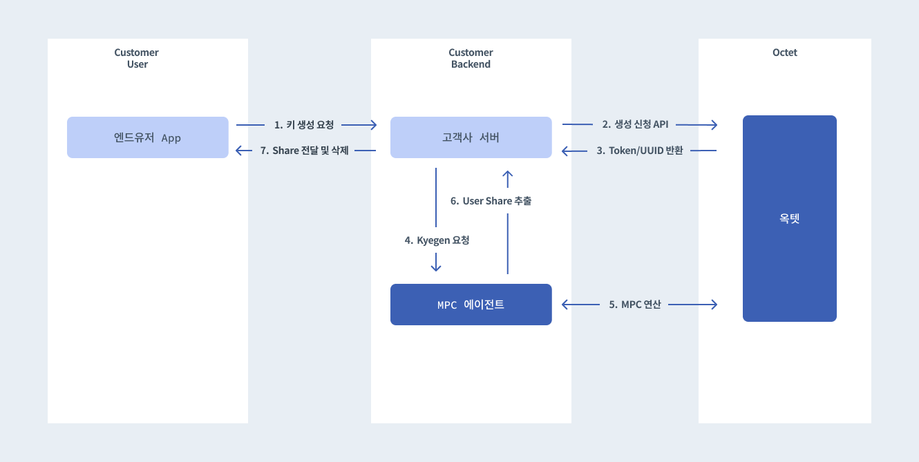 - MPC 키 생성 신청: 고객사는 옥텟 API를 호출하여 키 생성 작업을 요청하고 인증 토큰을 받습니다.