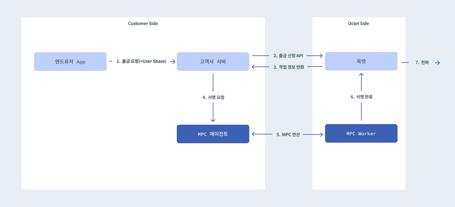 MPC 지갑에서의 출금은 엔드유저가 보유한 User Key Share와 옥텟이 보유한 Octet Key Share가 결합하여 서명을 생성하는 과정을 거칩니다.
