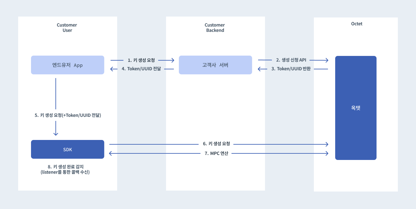 2. SDK 키 생성 요청: 엔드유저 앱 내의 옥텟 SDK가 발급받은 토큰과 UUID를 사용하여 옥텟 서버와 직접 통신하며 실제 키 생성 연산을 시작합니다.