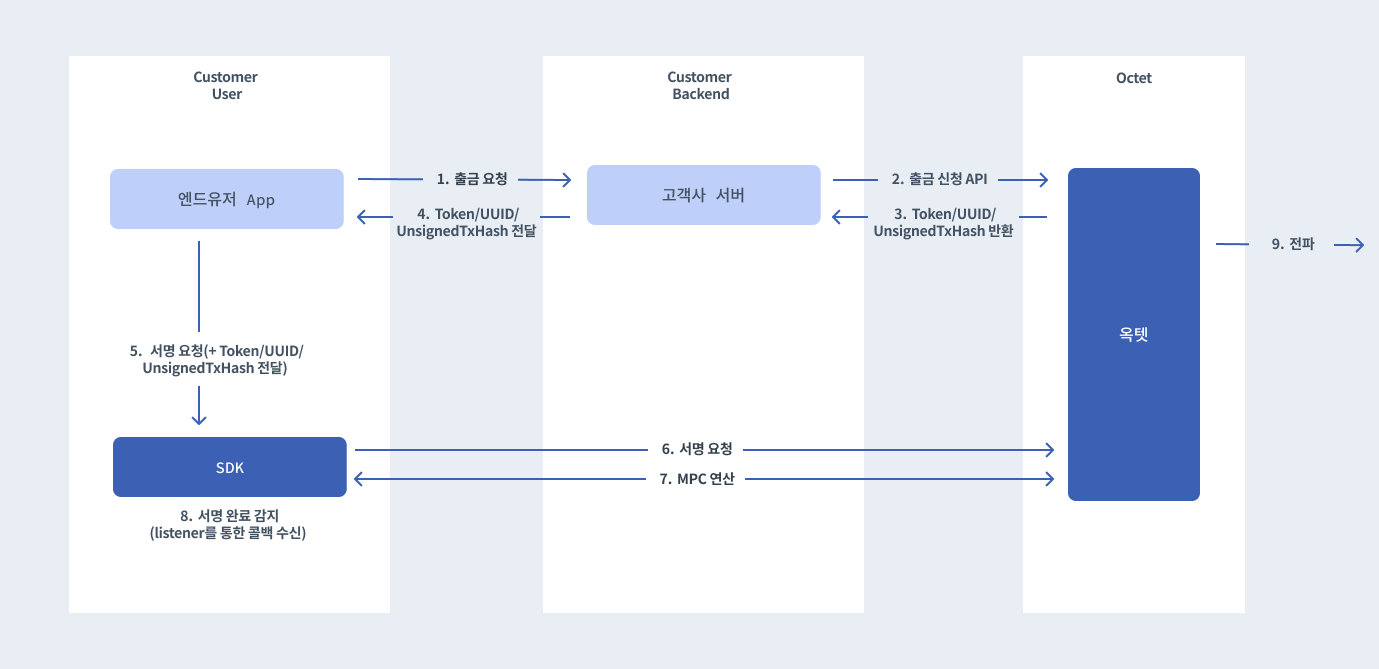 - 옥텟 출금 신청: 옥텟 API에 출금을 신청하고 서명 작업 정보를 받습니다.